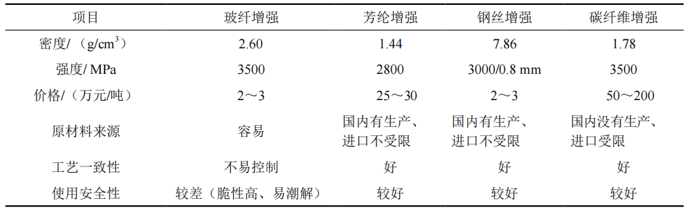 常見(jiàn)的增強材料有纖維增強材料和鋼絲增強材料[4]。從強度上看,玻璃纖維、碳纖維、鋼絲、芳綸都適合作為防垢型非金屬管道管的加強層材料,其性能比較見(jiàn)表 3。