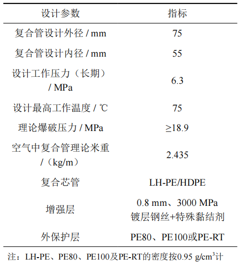 根據長(cháng)慶油田集輸油管道工況,采用鋼絲纏繞增強LH-PE非金屬復合管。該復合管為三層結構,內層為低表面能高分子聚乙烯(LH-PE)復合芯管,起到防結垢、防結蠟、防腐蝕以及流體密封作用;中間增強層由高強度鍍層鋼絲與特殊黏結劑組成,是內壓載荷及軸向載荷的主要承擔者,同時(shí)能夠承擔一定的外壓載荷;外保護層為高密度耐溫聚乙烯,在一定范圍內具有抗劃傷、抗磨損能力,對增強層及整個(gè)復合管起到保護作用。管體結構如圖 2所示。