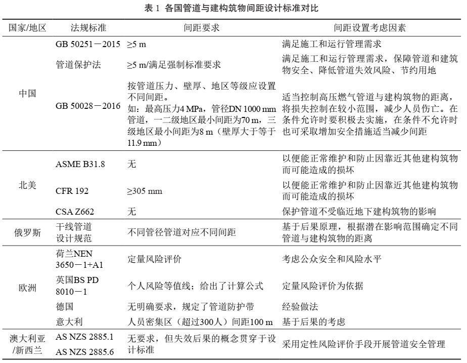 通過(guò)對比國內外標準,發(fā)現不同國家在設計階段對管道與建構筑物的間距要求、間距設置原則、考慮因素等均存在差異,國際上并沒(méi)有統一標準。對比主要結果見(jiàn)表 1。