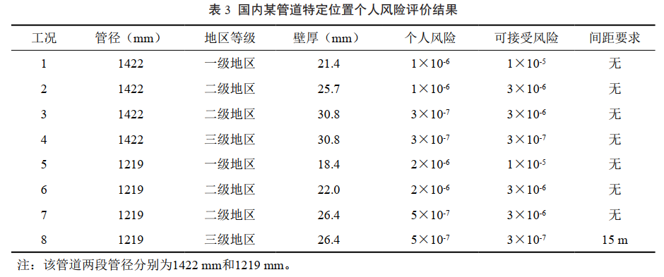 如果個(gè)人風(fēng)險、社會(huì )風(fēng)險或“10人”準則任何一項結果未滿(mǎn)足法規與標準要求,則管道與建構筑物間距不可接受,需要調整管道輸送參數或周邊建筑物分布;反之,三項結果均滿(mǎn)足才能判定油氣管道與建構筑物間距可以接受。