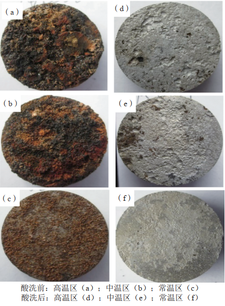 現場(chǎng)試片埋設時(shí)間為6個(gè)月,取出試片后,在實(shí)驗室先后將其進(jìn)行物理清理和化學(xué)酸洗。前者將試片表面沉積的泥土和沙子清除,即在水中浸泡10 min左右,用毛刷清除掉表面的土壤覆蓋層,觀(guān)察表面腐蝕產(chǎn)物顏色。后者是將拍照后的試片放入酸洗液(500 mL鹽酸,3.5 g六次甲基四胺,加蒸餾水配制成1000 mL)中,其作用是清除掉表面的腐蝕銹層,便于觀(guān)察腐蝕形貌和試片稱(chēng)重。隨后,分別將高溫區和中溫區試片的腐蝕產(chǎn)物進(jìn)行XRD成分分析。