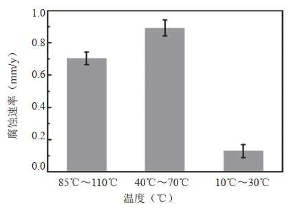 (1)在現場(chǎng)不同溫度環(huán)境下埋設試片6個(gè)月后,X70管線(xiàn)鋼腐蝕速率分別為常溫0.129 mm/y,中溫0.85 mm/y,高溫0.70 mm/y,中溫環(huán)境腐蝕速率最高。