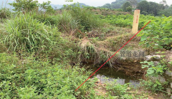 (3)巖溶塌陷。巖溶塌陷主要發(fā)生在巖溶地區。巖溶結構上方土體受自然或人為因素影響而變形破壞,會(huì )在地面形成塌陷坑、洞、槽等,并伴有裂縫、局部下沉,或有地下水從地面向上涌出等特征[4]。建設期,管溝采用石方回填,回填土長(cháng)期遭受地下水浸蝕,也會(huì )發(fā)育巖溶塌陷。巖溶塌陷會(huì )導致管道上方覆土流失,造成管道埋深不足、露管。嚴重時(shí)甚至造成管道懸空(圖 4)。