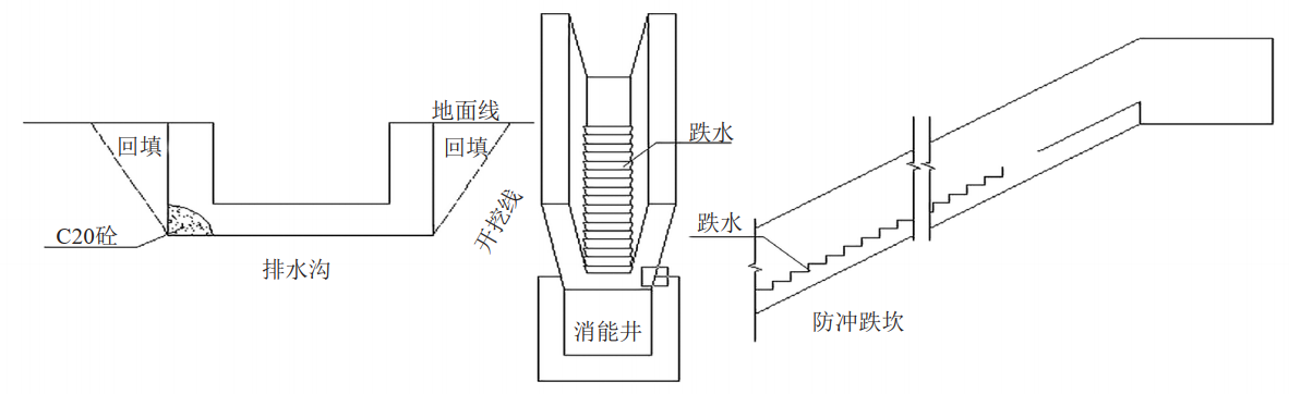 實(shí)踐證明,將排水溝(圖 5)、錨固、抗滑樁(圖 6)、擋土墻(圖 7)、削方減載壓腳等,兩種及以上措施相結合用以治理滑坡、不穩定斜坡,可取得良好成效。坡面水毀治理常采用截排水溝、擋墻、截水墻等。河溝道水毀主要采用護岸(圖 7)、過(guò)水面、地下防沖墻等措施。修建水工保護設施要結合地質(zhì)特征、特點(diǎn),因勢利導,要以疏水排水為原則,堅決不能以堵代疏。巖溶塌陷常采用清除填堵、灌漿加固、結構跨越的方式進(jìn)行處理。小型塌陷一般以清除填堵為主。開(kāi)挖難度較大的塌陷可將水泥砂漿、混凝土等材料通過(guò)巖溶洞口灌入洞隙中,以強化土層、洞空填充物,隔斷地下水通道。采用疏、導、排、圍等措施以阻止地表水下滲也很重要。