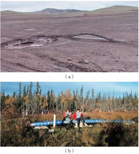 受油流熱力影響,格拉管道熱融沉陷明顯。1997年和2005年兩次勘探表明,管道周?chē)研纬芍睆綖?.4 m~1.5 m的融化圈(當地融化深度僅0.9 m)。近年來(lái),格拉管道多次因凍脹被擠出地面(距離地面高約0.7 m,長(cháng)約3.6 m),并在開(kāi)挖釋放應力時(shí)發(fā)生斷裂;地表以上最大翹曲上拱高度達0.5 m(管道埋深1.4 m,總翹曲上拱高度達到1.9 m)。