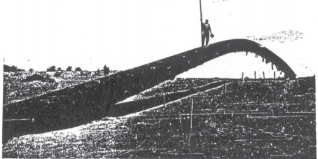 當埋地管道的輸送介質(zhì)或工作溫度大于施工溫度時(shí),管道將受軸向壓應力作用而可能產(chǎn)生軸向失穩屈曲。由于土壤阻力的原因,該失穩屈曲往往向上,常被稱(chēng)為翹曲上拱。在格拉管道、Norman Wells輸油管道,以及俄羅斯、伊朗、阿聯(lián)酋等國管道都出現過(guò)翹曲上拱。格拉管道沿線(xiàn)烏麗附近有大量?jì)雒,使得屈曲后的管道最大上浮位移達1.9 m,地面屈曲長(cháng)度約3.6 m(圖 1(a))。Norman Wells輸油管道在施工和運行中都因凍脹和融沉發(fā)生過(guò)翹曲上拱(圖 1 (b))。烏茲別克斯坦一條管徑1020 mm管道曾發(fā)生大位移翹曲上拱,如圖 2所示。