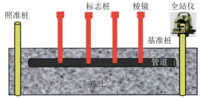 (3)管道位移監測。在監測區域安裝基準樁,在待監測管道安裝標志樁,定期測量各標志樁的坐標,若管道發(fā)生位移,則標志樁的坐標發(fā)生變化,兩次時(shí)間間隔的坐標變化即為該時(shí)間間隔內管道的位移。監測原理如圖 5所示。