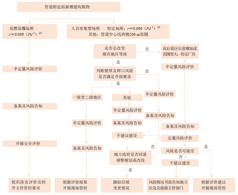 公司開(kāi)展周期性管道周邊規劃信息收集,預先識別高后果區新增及存量變化情況。當管道附近新增建構筑物足以改變現有地區等級,或導致原有高后果區增長(cháng)(包括長(cháng)度增長(cháng)、特定場(chǎng)所形成或常住人口數量增加等情況),或新增易燃易爆場(chǎng)所時(shí),要通過(guò)影響分析、風(fēng)險消減、備案及風(fēng)險告知、定量風(fēng)險評價(jià)、實(shí)施管控等五個(gè)環(huán)節開(kāi)展管理工作。風(fēng)險評價(jià)報告請縣級以上地方政府管道保護主管部門(mén)牽頭組織審查。對于風(fēng)險評價(jià)為不可接受的管段,向當地政府請示匯報,主動(dòng)協(xié)調重新選址或調整布局。對于風(fēng)險評價(jià)為可接受的管段,通過(guò)協(xié)商近管道一側土地規劃布局及用途等,減少雙方的相互疊加風(fēng)險,降低管道事故狀態(tài)對周邊人員和財產(chǎn)的潛在后果影響。對于風(fēng)險評價(jià)需要采取措施方可接受的管段,通過(guò)實(shí)施腐蝕防護、管道環(huán)焊縫專(zhuān)項整治、地質(zhì)災害防治、第三方施工防控、安全保衛等措施,并優(yōu)化管道周邊用地性質(zhì)以降低風(fēng)險。具體流程如圖 1所示。