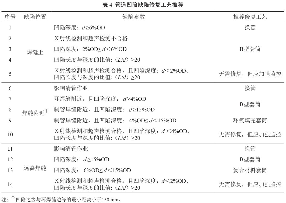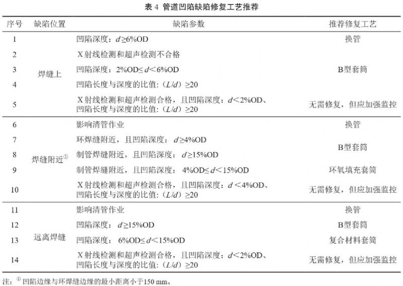 (5)凹陷缺陷修復。凹陷缺陷的穩定性介于制造缺陷和焊縫缺陷之間,首先要通過(guò)開(kāi)挖測量和無(wú)損檢測確定缺陷的位置和相關(guān)參數,根據測量和檢測結果確定修復工藝,凹陷缺陷修復工藝推薦詳見(jiàn)表 4。