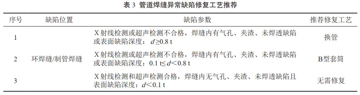 (4)焊縫異常缺陷修復。焊縫缺陷風(fēng)險較大,缺陷修復后的管道安全質(zhì)量是修復工藝比選的重中之重,可選擇換管或B型套袖修復工藝,詳見(jiàn)表 3。