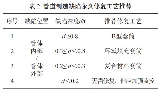 (3)制造缺陷修復。制造缺陷一般都是在制管過(guò)程中產(chǎn)生的,穩定性較強。在保證管道安全質(zhì)量的前提下,優(yōu)先選擇施工成本低、工期短、占地少且對生產(chǎn)和周邊影響都最小的修復工藝。制造缺陷修復工藝推薦詳見(jiàn)表 2。