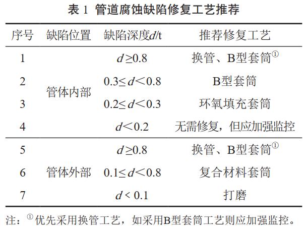 (2)腐蝕缺陷修復。先確定腐蝕缺陷的位置和相關(guān)參數后,再結合高后果區實(shí)際情況進(jìn)行分析和比對。如某管道內部腐蝕缺陷深度大于0.8 t,且處于施工場(chǎng)地狹小的人員密集型高后果區,為保證修復后管道本體質(zhì)量安全并最大限度減少對管道周邊公眾的影響,最佳修復工藝推薦B型套筒,詳見(jiàn)表 1。