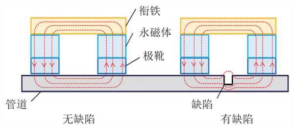 圖 1給出了漏磁檢測基本原理示意圖[4,5]:磁化器中的永磁鐵產(chǎn)生磁場(chǎng),并通過(guò)極靴、銜鐵和管道形成完整的磁回路。由于管材的磁導率遠大于空氣,當管壁無(wú)缺陷時(shí),通過(guò)管道的磁感線(xiàn)大多被約束在管壁內部。而當管道出現凹坑、裂紋等切割磁力線(xiàn)的缺陷時(shí),由于缺陷處磁阻遠遠大于管材,會(huì )使部分磁感線(xiàn)從管壁漏出,形成漏磁場(chǎng),可被管道上方的磁敏感傳感器接收,通過(guò)檢測到的相關(guān)信號的變化,可對缺陷的幾何特征及位置進(jìn)行分析與判別。