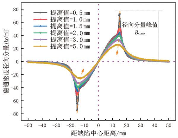從圖 3可以看出,隨著(zhù)提離值的增高,磁通密度徑向分量明顯降低。這是由于空氣中磁阻較大,磁力線(xiàn)趨向于從磁阻小的管壁內通過(guò),提離值越高,距離管壁越遠,磁力線(xiàn)分布越稀疏,故而磁通密度越小。同時(shí),由圖 4結果可以看出:磁通密度徑向分量峰值(取值方法如圖 3所示)隨提離值增高呈非線(xiàn)性衰減趨勢,且在提離值較低時(shí),衰減速率較快,隨提離值增高,衰減速率逐漸變緩,該結果與文獻[8]中的結果是一致的。