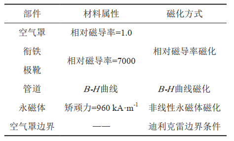 采用COMSOL軟件來(lái)模擬漏磁檢測過(guò)程,結合文獻[6,7]中的研究和實(shí)際檢測裝置,建立了如圖 2所示的有限元模型及網(wǎng)格劃分。為簡(jiǎn)化模型,這里采用平板代替管子,并在外圍構建空氣罩模擬磁場(chǎng)在空氣中的分布情況。缺陷Ω采用半橢球凹坑來(lái)表征,缺陷參數分別為凹坑直徑L和凹坑深度D,即一個(gè)管道缺陷可表示為Ω(D, L)。表 1給出了模型中各部件材料屬性、磁化方式以及邊界條件定義。