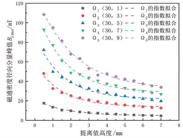 (2)指數擬合可以較好地表征磁通密度徑向分量峰值Bx_max隨提離值增高而衰減的變化趨勢。