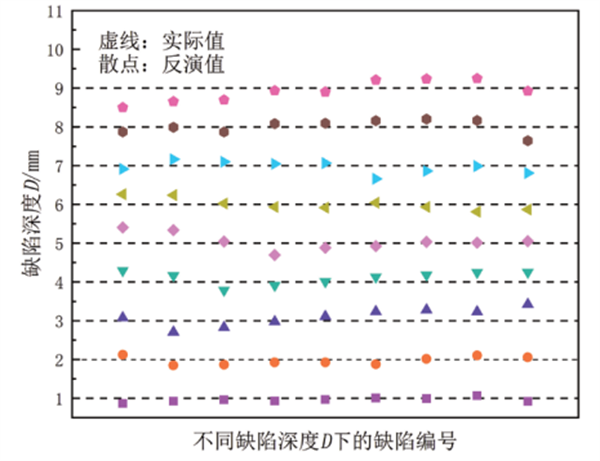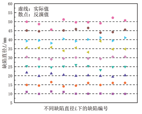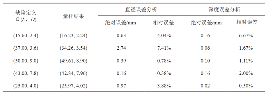 圖 8中虛線(xiàn)表示缺陷的實(shí)際尺寸,樣本點(diǎn)表示通過(guò)神經(jīng)網(wǎng)絡(luò )算法進(jìn)行缺陷反演得到的缺陷尺寸。由結果可以看出,本文的反演方法可以準確地量化缺陷尺寸,相對誤差幾乎都在10%以下,絕大部分誤差在5%左右。同時(shí),為進(jìn)一步驗證此反演方法的可靠性和準確性,本文隨機選取了5組缺陷帶入訓練結果進(jìn)行反演,得到結果如表 2所示?梢(jiàn),本文提出的缺陷量化方法精確度較高,可為實(shí)際工程中缺陷反演提供新的思路和理論支持。