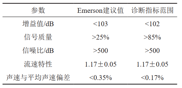 實(shí)時(shí)監測5個(gè)基本參數值并與Emerson廠(chǎng)家建議的診斷參數標準對比,可以發(fā)現流量計各聲道相應數據與診斷指標的差異,據此可初步判斷數據異常聲道可能存在臟污或探頭故障等,需對相應探頭進(jìn)行拆檢,清除探頭表面臟污或者更換、調整探頭參數。定期進(jìn)行聲速核查,基本可以辨別超聲波流量計的整體表現。Emerson廠(chǎng)家建議的診斷參數標準如表 1所示。