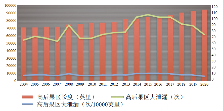 (1)高后果區管道長(cháng)度及泄漏統計。全美輸油管道高后果區長(cháng)度從2004年的7萬(wàn)多英里增加到2020年的9萬(wàn)多英里,遠超過(guò)輸氣管道高后果區長(cháng)度。占全部輸油管道里程比例長(cháng)期保持在40%以上,2020年為41.9%,其長(cháng)度比例也遠超輸氣管道。高后果區管道泄漏平均每年每1萬(wàn)英里發(fā)生10次,平均每年60~110次不等,見(jiàn)圖 4。