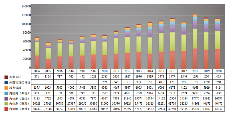 圖 2 輸氣管道完整性評價(jià)統計(2010-2020年)