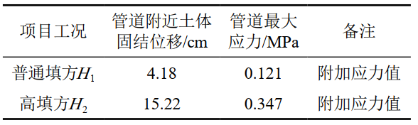由于管道下部欠固結土的不均勻沉降,將引起其中敷設管道的受力不均。對于填方4 m(H1)和14 m(H2)的土體,其沉降值有明顯差異,如表 2所示。本文采用有限元計算方法(圖 2),計算不同高度回填土的土體沉降值和由此產(chǎn)生的管道附加應力值。