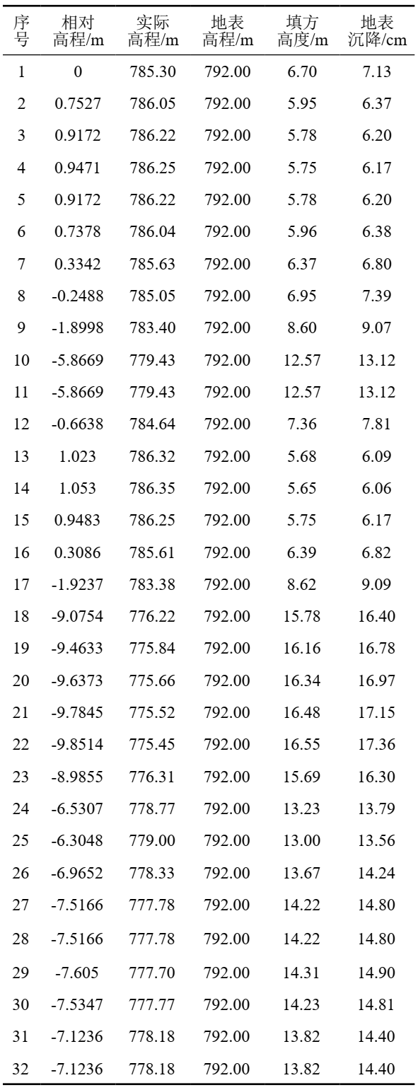 根據有限元應變計算結果,得到不同高度填方的管道關(guān)鍵節點(diǎn)處地表沉降值,如表 4所示。