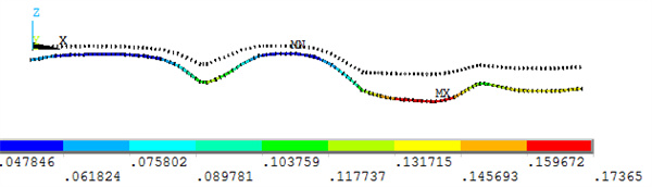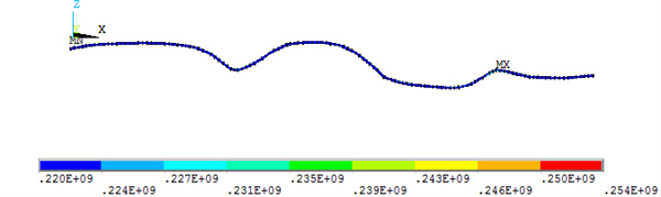 高填方區管道除了受內壓、溫差、走向變化影響外,同時(shí)受土體不均勻沉降的作用;輸氣管道最大位移范圍為0.04 m~0.17 m,最大應力點(diǎn)組合應力值為254 MPa(圖 5),最大組合應力雖略有增高,但遠小于X80鋼管材質(zhì)允許極限應力值(499.5 MPa),可判定管道運營(yíng)處于安全狀態(tài)。