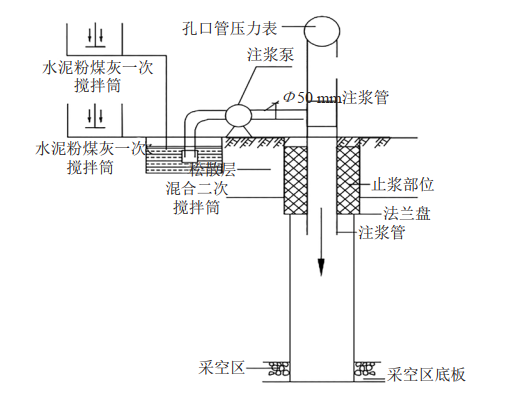 (6)鉆孔封孔。對未鉆至采空區的鉆孔,采用水灰比為 0.5∶1 的單液水泥漿封孔,鉆至采空區的鉆孔暫不封孔,留作后期注漿孔使用。