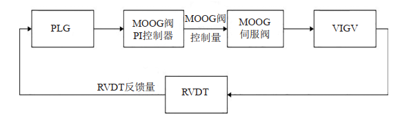 VIGV(Variable Inlet Guide Vans,可調進(jìn)口導葉)位于壓氣機上,由一個(gè)MOOG伺服閥控制三個(gè)液壓作動(dòng)筒調節其角度,通過(guò)RVDT監控液壓作動(dòng)筒位置進(jìn)行安全保護[2],以保證壓氣機的第一級葉片始終處于設計狀態(tài),有效防止壓氣機喘振。MOOG閥采用PI控制原理,比較設定值和反饋值得出偏差值,然后將此差值按比例放大和積分運算后,作用在MOOG伺服閥的壓電元件上,對VIGV進(jìn)行較正,使反饋值不斷接近設定值[3]。如圖 2所示。