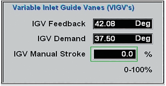 (2)排查要點(diǎn)。首先檢查油泵及供電,若正常運行,再檢查VIGV液壓油的壓力及溫度應保持在7000±170 kPa(1000±25 psig)、 60±5℃范圍內。若油路堵塞,VIGV運行不穩定則表現為對進(jìn)氣擺葉進(jìn)行連續開(kāi)關(guān)調整。
