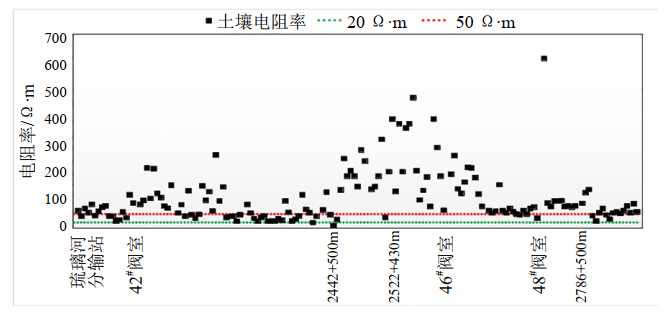 圖 4為位于良鄉站上游的琉璃河分輸站至西沙屯分輸站土壤電阻率測試結果。各測試樁處測試深度2~3 m,其中44#—47#閥室段測試間隔不低于500 m加密測試,共測試154處土壤電阻率。依據GB/T 21246―2020《埋地鋼制管道陰極保護參數測量方法》,其中115處土壤電阻率大于50 Ω·m,腐蝕評價(jià)為“弱”;38處為20 Ω·m~50 Ω·m,腐蝕評價(jià)為“中”;1處小于20 Ω·m,腐蝕評價(jià)為“強”。44#—47#閥室段管道經(jīng)過(guò)門(mén)頭溝山區,附近土壤電阻率明顯高于其他管段,最高可達500 Ω·m,過(guò)高的土壤電阻率將影響及減小陰極保護電流在管道上的分布。