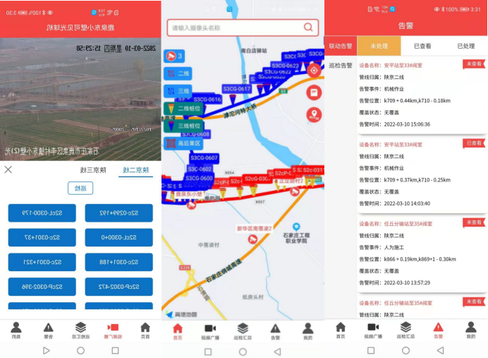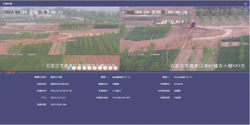 石家莊輸油氣分公司地處“京津冀”要地,天然氣管道穿越高鐵、高速公路、河道、人口密集型高后果區情況普遍,第三方施工損壞風(fēng)險較高。2021年對陜京二線(xiàn)259公里管道啟用光纖振動(dòng)預警系統,在傳統的人機聯(lián)防模式下,巡護工接到電話(huà)或告警短信后到達事發(fā)現場(chǎng),作業(yè)區管道管理人員根據現場(chǎng)風(fēng)險等級給出處理措施并協(xié)調相關(guān)資源。由于光纖預警系統穿越區域條件復雜,誤告警情形難以避免,導致大量無(wú)效人力物力成本的付出。還由于巡護工到達現場(chǎng)存在時(shí)間差,無(wú)法及時(shí)防范管道損壞事件的發(fā)生。2022年石家莊輸油氣分公司利用陜京二線(xiàn)周邊2公里范圍內的中國鐵塔公司存量高清攝像機,采取光纖預警與視頻監控兩者聯(lián)動(dòng),結合人工智能識別技術(shù),用較低成本解決了這一難題。