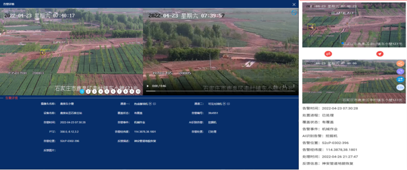 石家莊分公司陜京二線(xiàn)鹿泉至正定區間約40公里光纖預警與視頻監控無(wú)縫聯(lián)動(dòng),接入鐵塔公司攝像頭20個(gè)。投入運行三個(gè)多月,辨識高危行為260條,低風(fēng)險行為101條。實(shí)例一,光纖預警系統發(fā)出機械施工告警,通過(guò)聯(lián)動(dòng)視頻監控核實(shí)管道周邊存在機械取土行為(圖 8)。實(shí)例二,光纖預警告警聯(lián)動(dòng)視頻監控系統告警下發(fā)APP,作業(yè)區段長(cháng)立即趕到現場(chǎng)核實(shí)事件并進(jìn)行處置,通過(guò)APP反饋處置結果(圖 9)。