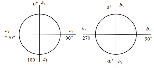 (2)按照齒輪箱旋轉方向盤(pán)車(chē),旋轉至90°、180°、270°,分別記錄百分表讀數(圖 3, a、b各代表百分表測量的對中偏差值讀數),并計算得出偏差值S:S1=(a1+b3)/2;S2=(a2+b4)/2;S3=(a3+b1)/2;S4=(a4+b2)/2。
