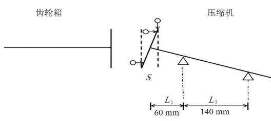 Y偏差調整量,mm;D為2塊百分表之間的距離,mm;L1前腳到測量點(diǎn)的距離,mm;L2后腳到前腳的距離,mm;S軸向偏差值,mm。