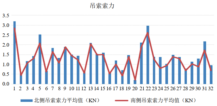 (2)索力檢測。按照實(shí)測索力和設計索力比值及受力均勻程度進(jìn)行評價(jià)。索力檢測主要針對主索及吊索等受力支撐結構,采用索力動(dòng)測儀進(jìn)行測量。檢測結果:主索及吊索索力均低于設計破斷索力,其實(shí)際受力均在許用應力范圍內,但存在東西兩側吊索索力分布不均現象,西側吊索相對于東側吊索差值百分比大于10%的共有19組,最大相差47.07%,如圖 3所示。雖然標準沒(méi)有明確規定,但主索和吊索索力分布不均容易導致塔架偏位風(fēng)險,應調整吊索使其受力均勻。