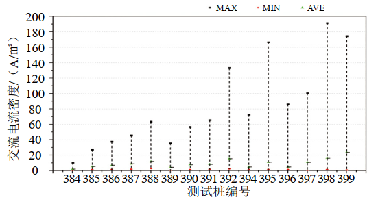 (2)在管道交流干擾峰值的2個(gè)位置采取干擾防護措施,可將全線(xiàn)管道的交流電流密度降至30 A/㎡內,建議在388#和393#測試樁處增加70 m和40 m鋅帶排流措施。