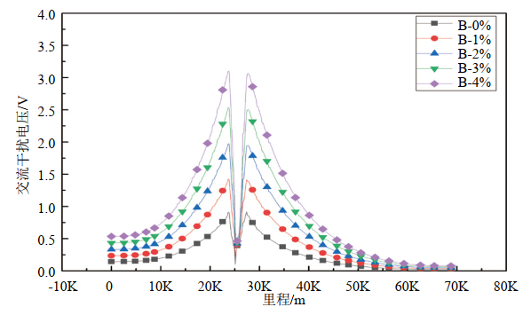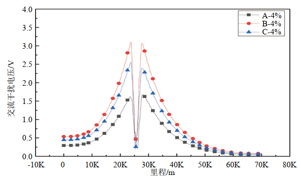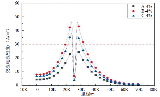 在不同相位的不平衡度分別達到4%,管道沿線(xiàn)的交流電壓和交流電流密度模擬計算結果見(jiàn)圖 6。結果顯示,不同相保持不平衡度時(shí),管道的交流干擾程度差異性較大,其中在B相不平衡度為4%時(shí),管道受到的交流干擾最大。
