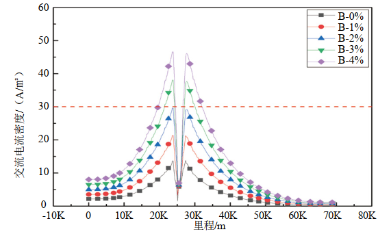 交流輸電線(xiàn)路正常運行時(shí),由于電壓波動(dòng)導致三相電流不平衡,GB/T 15543-2008《電能質(zhì)量三相電壓不平衡》規定“電網(wǎng)正常運行時(shí),長(cháng)時(shí)電壓不平衡度不超過(guò)2%,短時(shí)不得超過(guò)4%”。在B相線(xiàn)路與其他二相存在不同不平衡度時(shí),管道沿線(xiàn)的交流電壓和交流電流密度的模擬計算結果見(jiàn)圖 5。結果顯示,輸電線(xiàn)路B相不平衡度達到4%時(shí),管道交流電壓達到3.1 V,交流電流密度達到46.599 A/㎡,交流電壓峰值出現在輸電線(xiàn)路開(kāi)始并行和結束并行的位置。輸電線(xiàn)路的三相不平衡度越高,對管道的交流干擾越大,在輸電線(xiàn)路的B相不平衡度大于2%時(shí),管道沿線(xiàn)部分位置的交流電流密度高于30 A/㎡。