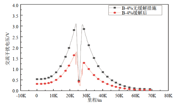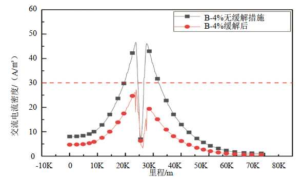 在輸電線(xiàn)路B相不平衡度為4%時(shí),管道部分位置的交流電流密度高于30 A/㎡,根據國內外評價(jià)指標規定,本次干擾緩解目標為輸電線(xiàn)路造成的交流電流密度小于30 A/㎡。