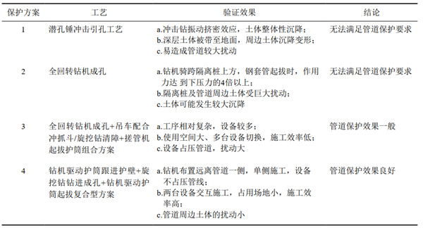 (2)比選驗證管道保護方案。正式施工前,在遠離管道處進(jìn)行試樁試驗,比選隔離樁施工工藝及組合工藝對管道影響程度和實(shí)際防護效果,驗證效果見(jiàn)表 1。經(jīng)過(guò)試驗比選,最終采用方案4,可以最大限度降低對管道周邊土體擾動(dòng),管道保護效果較好,同時(shí)提高了施工工效,縮短了施工周期,見(jiàn)圖 2。
