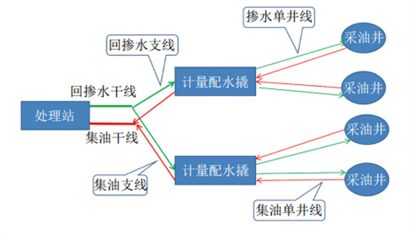 某油田稠油井區采用注水冷采開(kāi)發(fā)油藏,集輸方式采用摻熱水雙管集輸工藝,回摻水管線(xiàn)和集油管線(xiàn)為同溝敷設。井區根據油品黏度分為3個(gè)黏度區域,即油品溫度50℃,黏度1000 mPa·s以下(簡(jiǎn)稱(chēng)區域一),1000 mPa·s~2000 mPa·s(簡(jiǎn)稱(chēng)區域二)及2000 mPa·s~3000 mPa·s以上(簡(jiǎn)稱(chēng)區域三)。如圖 1所示,摻熱水雙管集輸工藝流程為:油水混合物由采油井采出后,通過(guò)集油單井線(xiàn)進(jìn)入到計量配水撬,計量后通過(guò)集油支線(xiàn)、干線(xiàn)進(jìn)入到處理站,經(jīng)處理后處理站得到回摻水,加熱后通過(guò)回摻水干線(xiàn)、支線(xiàn),由計量配水撬為摻水單井線(xiàn)配水向采油井口摻水。