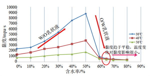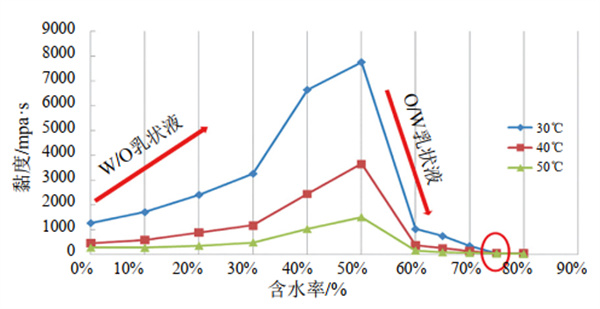 測試不同黏度區域稠油油包水乳狀液的體積含水率和50℃黏度。然后,采用黃啟玉“反演法”,在實(shí)驗室制備出相同含水率、黏度相近的油包水乳狀液。