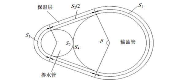 現場(chǎng)摻水干支線(xiàn)和集油干支線(xiàn)采用聯(lián)合保溫模式,單井線(xiàn)采用單獨保溫模式;趥鳠釋W(xué)原理建立模型。
