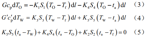 式中:K1、K2、K3、K4、K5分別為集油管遠離摻水管一側管壁、管內空氣到管外土壤、摻水管遠離集油管一側管壁、集油管靠近摻水管一側管壁、摻水管靠近集油管一側管壁總傳熱系數,W/(㎡·℃);G、G'分別為集油管、摻水管質(zhì)量流量,kg/s;ta、Tf分別為雙管之間空氣溫度、管外土壤溫度,℃;TO、TW分別為集油管、摻水管內介質(zhì)起始溫度,℃;cp、c'p分別為集油管、摻水管內介質(zhì)比熱容,J/(kg·℃);z為管道總長(cháng)度,m;l 為計算管段長(cháng)度,m。