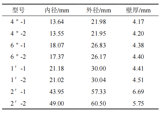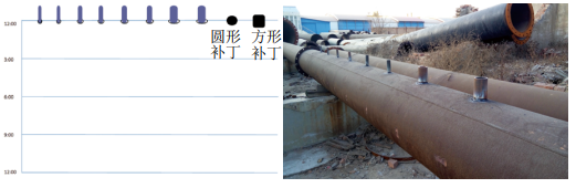 在管徑為457 mm,壁厚為7.1 mm的牽拉管段上預制了不同尺寸的焊接鋼管(表 1、圖 1)及人工通孔和補。ū 2),全面模擬與現場(chǎng)盜油孔信號相似的管道特征物。這四種管道特征物分別為:通孔(未焊接鋼管)、 焊接鋼管(只焊接鋼管、未打孔)、小開(kāi)孔(打通孔后焊接鋼管)、補丁。