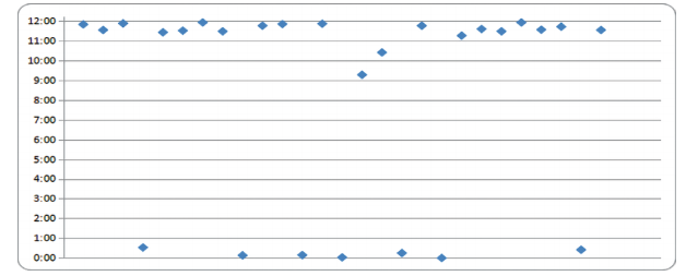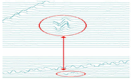 實(shí)際工程應用發(fā)現,工業(yè)現場(chǎng)管道盜油孔周向位置普遍處于管道頂部09:00~00:30時(shí)鐘方向(圖 2)。在依據實(shí)際管道檢測數據分析盜油孔時(shí),需要重點(diǎn)對8:00~4:00(順時(shí)針)即管道頂部的疑似小開(kāi)孔信號進(jìn)行篩查,能最大限度排查管道盜油孔。