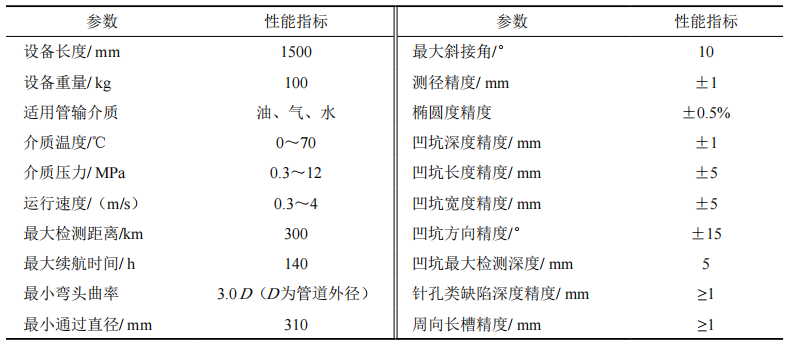 根據需求,基于脈沖渦流原理對管道進(jìn)行金屬損失檢測,同時(shí)集幾何測徑和管道中心線(xiàn)測繪功能于一體,研制一套適用于管徑406 mm雙金屬管道的專(zhuān)項復合檢測器(以下簡(jiǎn)稱(chēng)專(zhuān)項檢測器)。通過(guò)高密度渦流傳感器和高采樣率對內襯管腐蝕情況進(jìn)行準確檢測和尺寸確定,用幾何測徑傳感器進(jìn)行高精度幾何測徑和凹痕尺寸檢測。最終確定檢測器的總體設計方案和各項參數性能指標(表 1)。