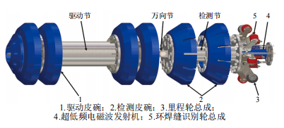 專(zhuān)項檢測器主體結構按功能劃分為驅動(dòng)節和檢測節,兩節之間由萬(wàn)向節串聯(lián)連接。驅動(dòng)節前、后共裝有4個(gè)碟形驅動(dòng)皮碗,最大皮碗間距為1.6 D(為管道外徑),驅動(dòng)皮碗過(guò)盈量4.7 %用以密封管輸介質(zhì),提供驅動(dòng)力和支撐整節結構重量。驅動(dòng)節的耐壓艙體內裝有鋰電池供電系統提供電能。檢測節主要由兩個(gè)交錯安裝的檢測皮碗、里程輪總成、環(huán)焊縫識別輪總成、支撐輪總成、超低頻電磁波發(fā)射機等組成。檢測節的耐壓艙體內裝有電子系統和管道中心線(xiàn)測繪單元,如圖 3所示。