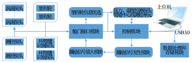 檢測器電子系統采用模塊化設計[12],按照功能劃分為控制模塊、激勵信號發(fā)生模塊、激勵信號放大模塊、艙門(mén)接口模塊、數據處理和存儲模塊等[13],內部還集成了壓力、溫度和管道中心線(xiàn)測繪單元。渦流探頭與測徑探頭等通過(guò)艙門(mén)結構模塊與電子系統相連,如圖 6所示。
